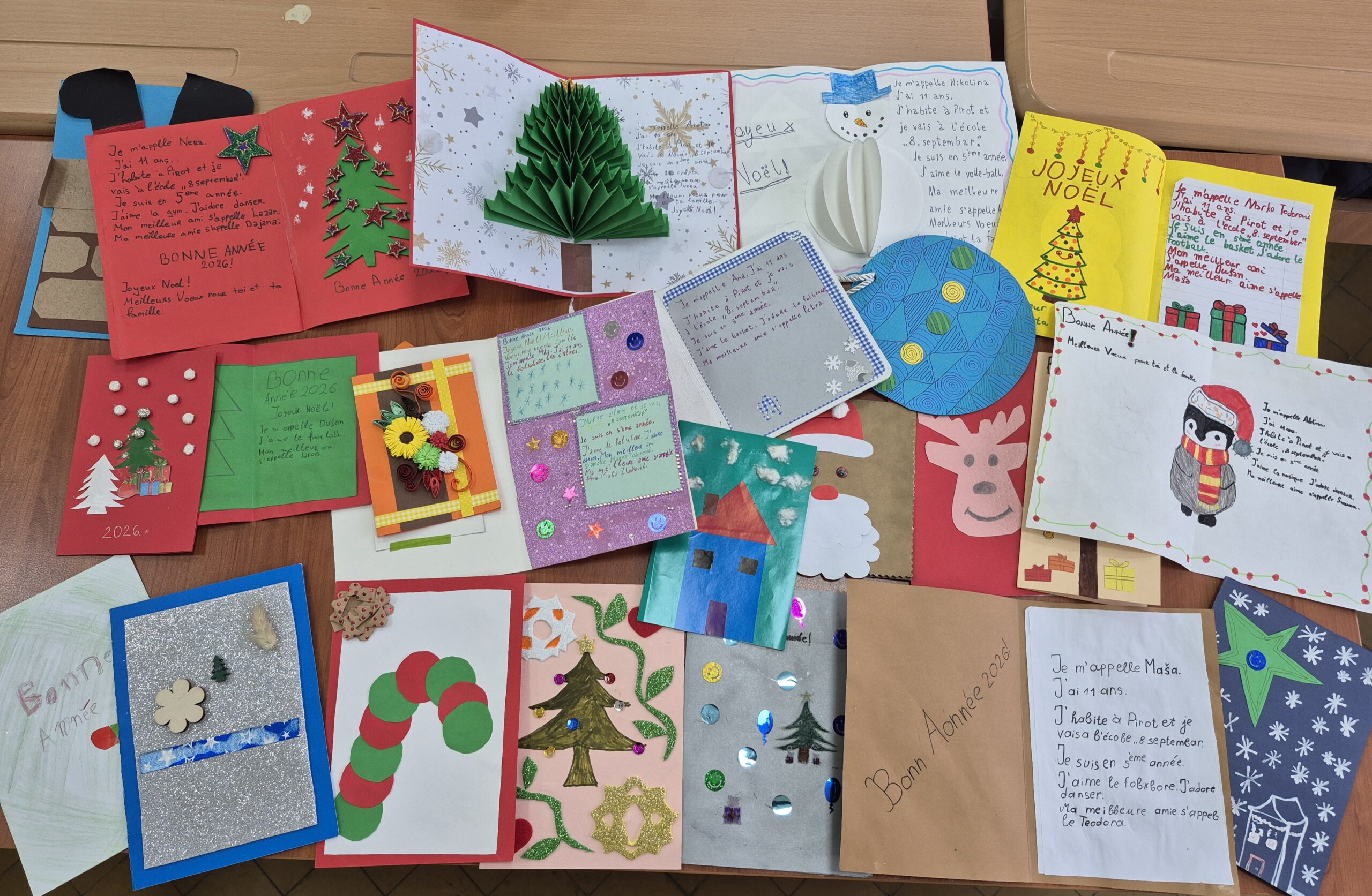 У организацији наставница Ане Марковић из Основне школе „Душан Радовић” у Бору и Наташе Петровић из Основне школе „8. септембар” у Пироту, ученици петог разреда ове две школе разменили су новогодишње честитке на француском језику.